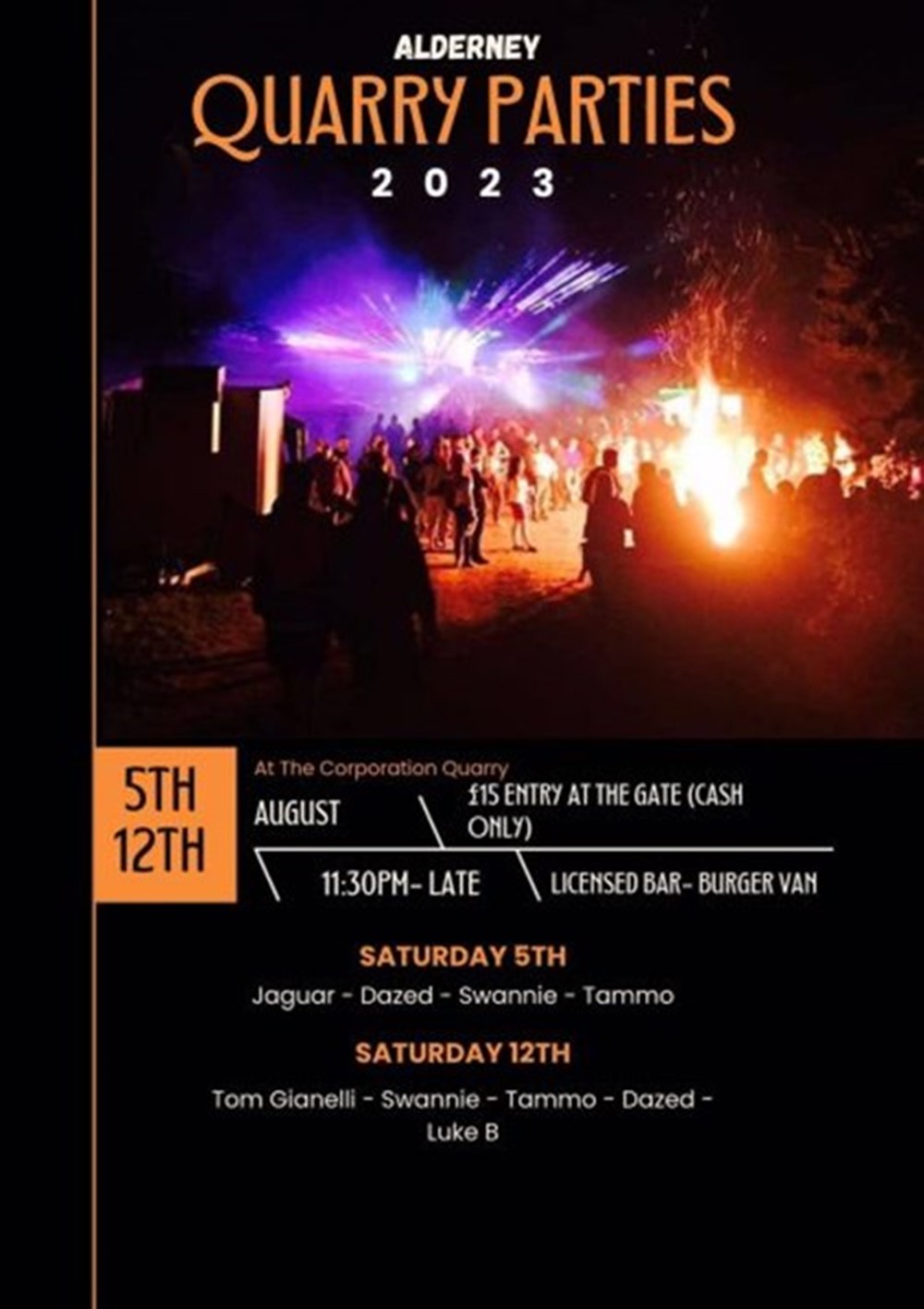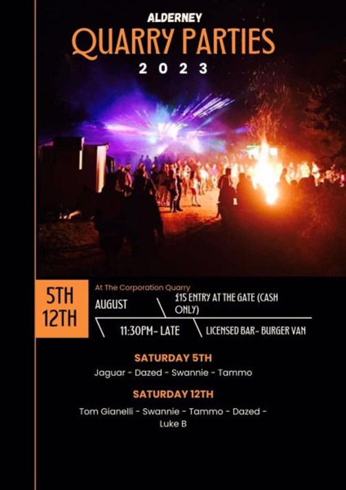 The Quarry Parties in Alderney are extraordinary annual events, renowned as the biggest parties of the year. Held at the quarry, it features a licensed bar, a roaring bonfire, and DJ music that keeps the crowd dancing until the sun rises and beyond. This unforgettable celebration unites people in a night of joy and memories. £15 per person (cash only), licensed bar and burger van on site.