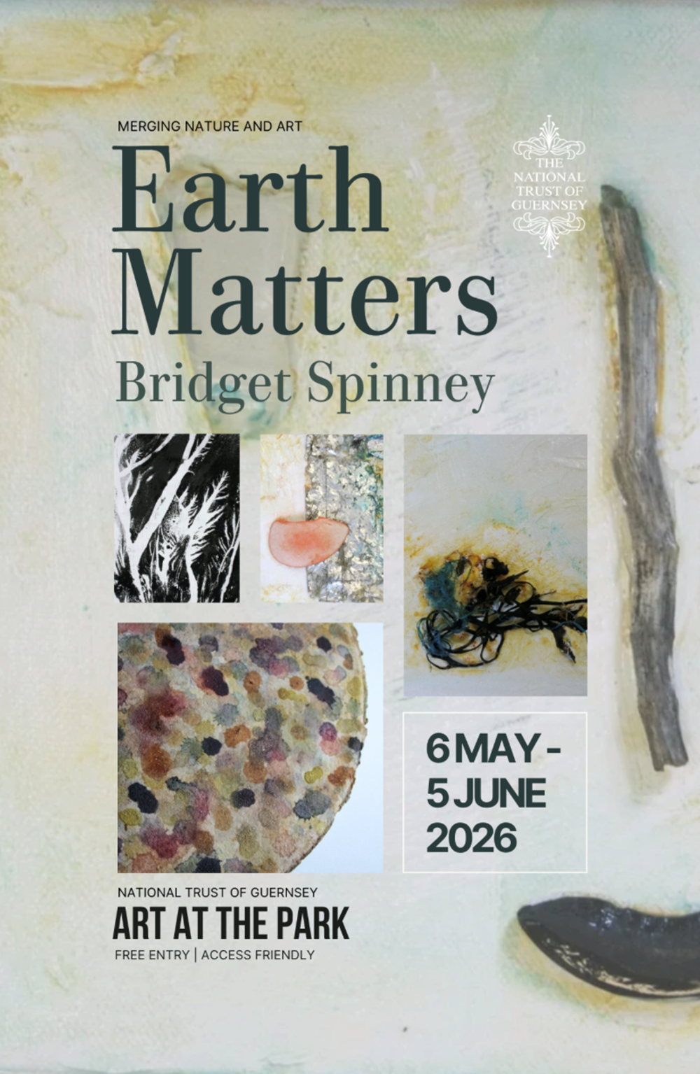 'Earth Matters' is a new art exhibition by Bridget Spinney. It opens at the National Trust of Guernsey's Art at the Park Gallery at the Folk and Costume Museum on Wednesday 6th May and runs until Friday 5th June. Opening times are 10am until 5pm daily (Please be aware that the exhibition will close at 2pm on the final day.). The Gallery is free entry and accessible friendly.