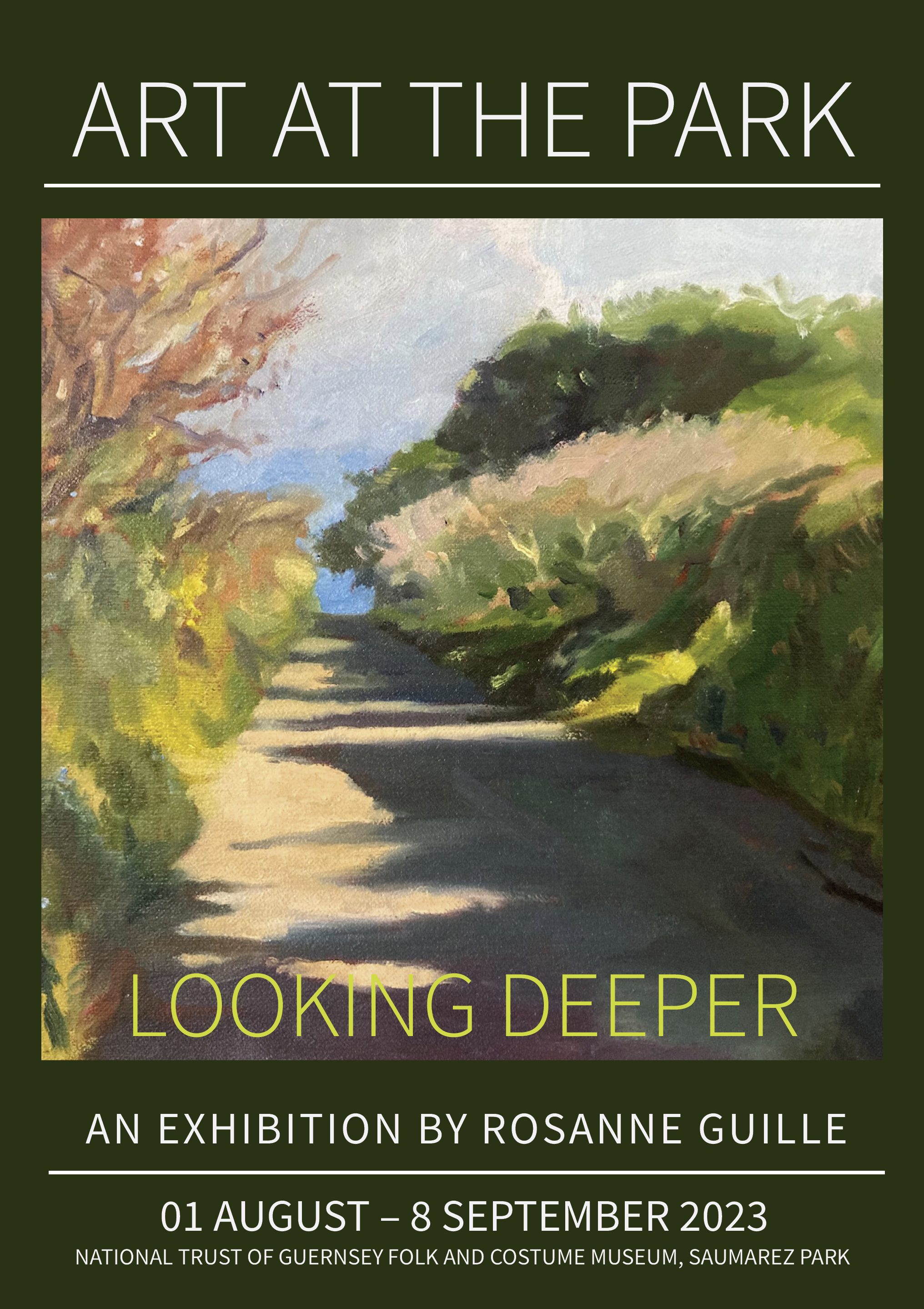 The exhibition is at the Art at the Park Gallery, the Folk and Costume Museum in Saumarez Park from Tuesday 1st of August until Friday the 8th of September 2023 . It is open daily from 10am until 5pm and is fully accessible.
