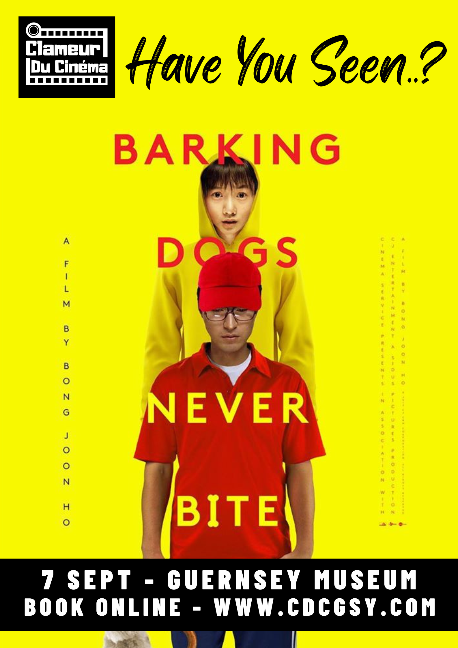 Barking Dogs Never Bite is being screened at 7.30pm, Wednesday 7 September 2022 at The Frossard Theatre, Guernsey Museum. Tickets cost £7 / £5 / £10 and can be booked via www.cdcgsy.com.