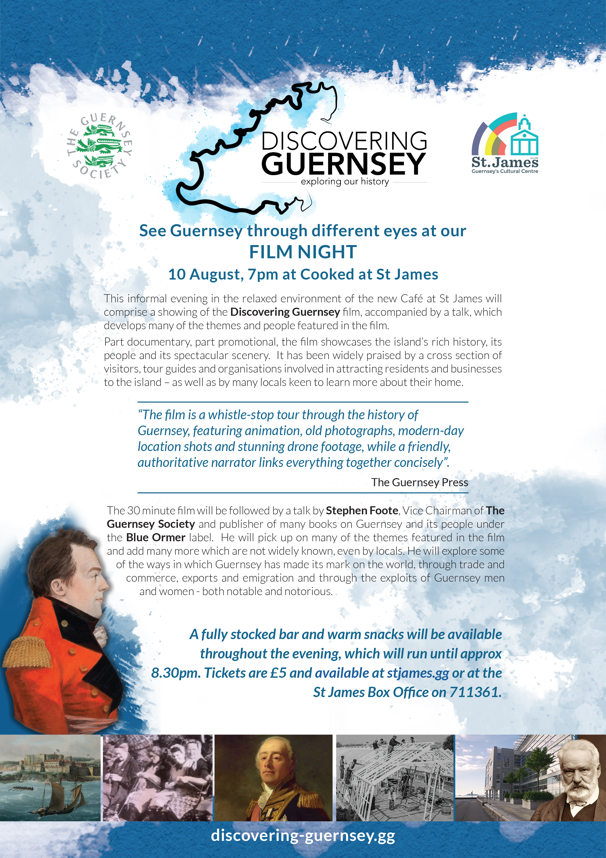 This informal evening in the relaxed environment of the new Café at St James will comprise a showing of the Discovering Guernsey film, accompanied by a talk, which develops many of the themes and people featured in the film.