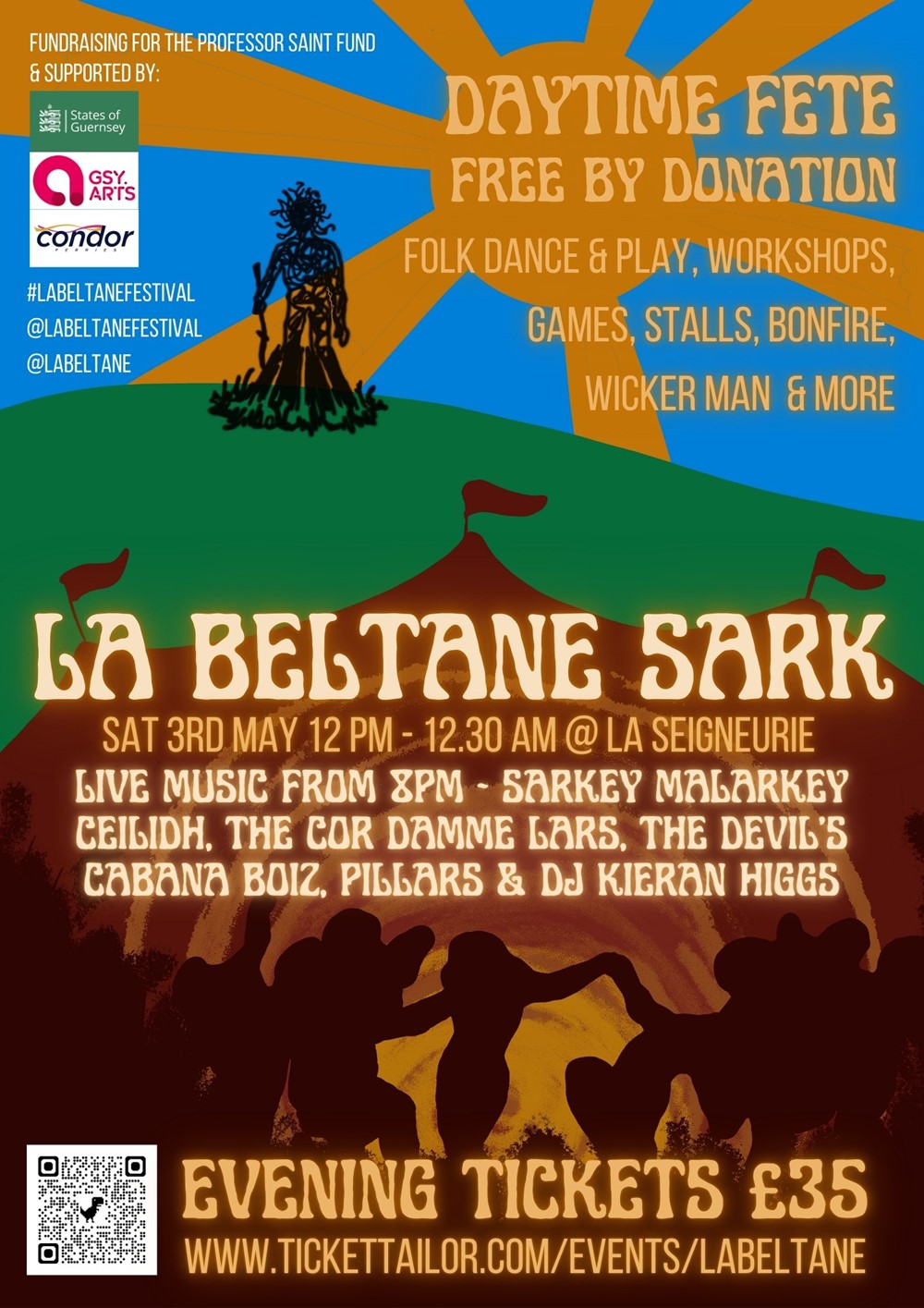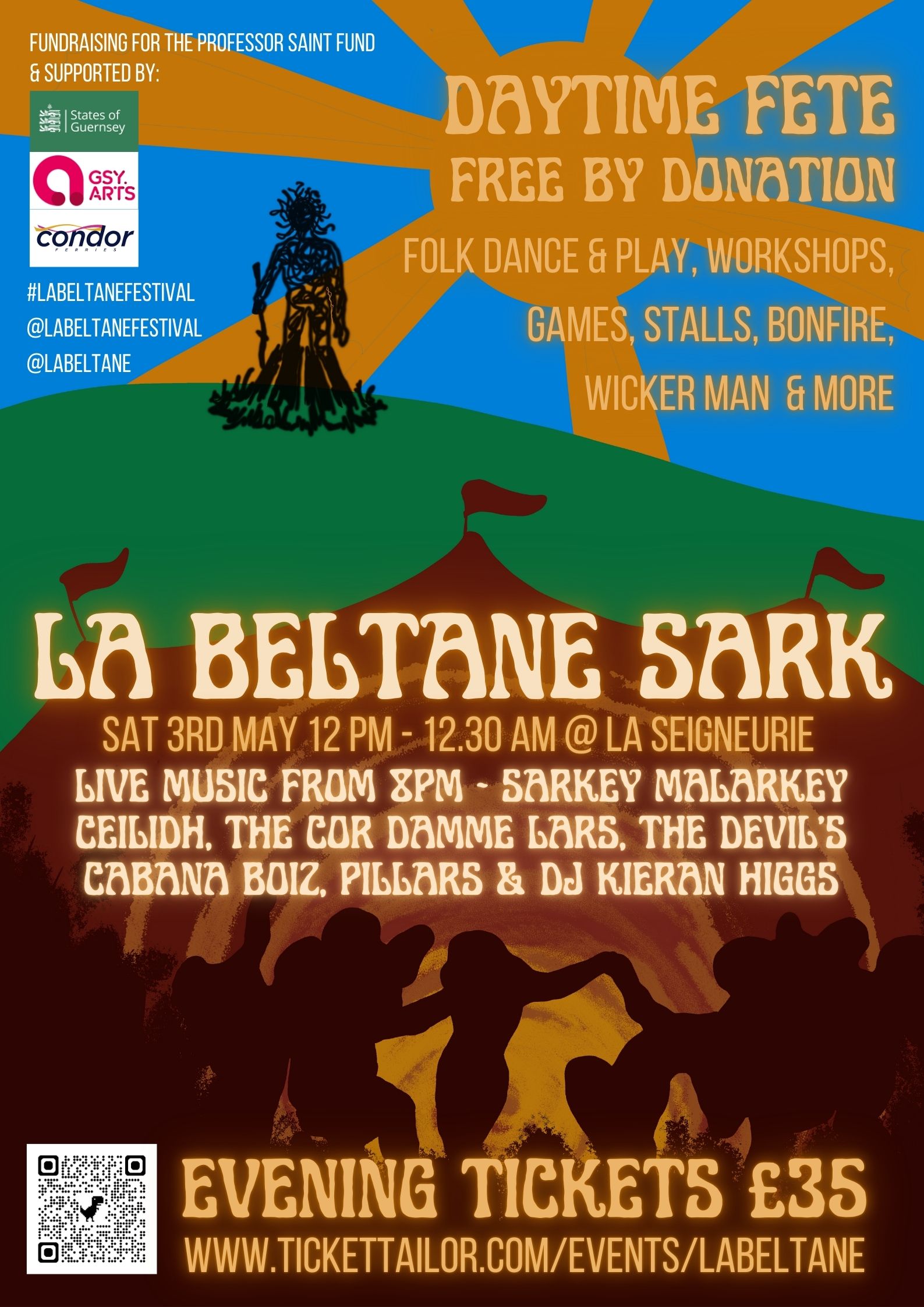 The daytime fayre is by donation on the door, the proceeds of which always go to a local charity. This year, we are supporting Sark’s Professor Saint Fund, which subsidises prescription charges for Sark Residents. The evening event is £35, and tickets are available at https://www.tickettailor.com/events/labeltane/1467376