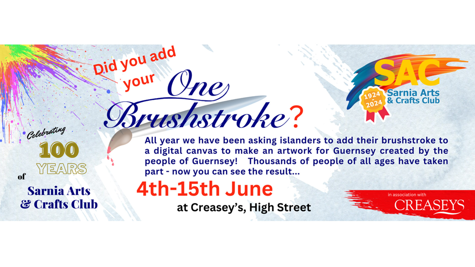 To celebrate their 100th anniversary Sarnia Arts & Crafts Club have been asking islanders to add ‘one brushstroke’ to a digital canvas to create an artwork made for, and by, the people of Guernsey. The project has taken a year to complete and thousands of islanders have taken part resulting in 13 fabulous paintings which will all be printed and displayed in Creasey’s High Street Department Store between 4th - 15th June. See if you can find your brushstroke.