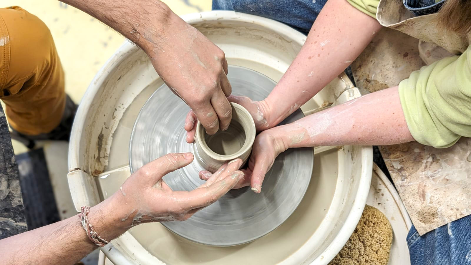 Please wear comfortable clothing that you are relaxed about getting messy. We recommend trousers as you’ll sit close to the wheel as you throw. Please ensure long hair is tied back, jewellery, watches, long necklaces, scarves etc are removed.
