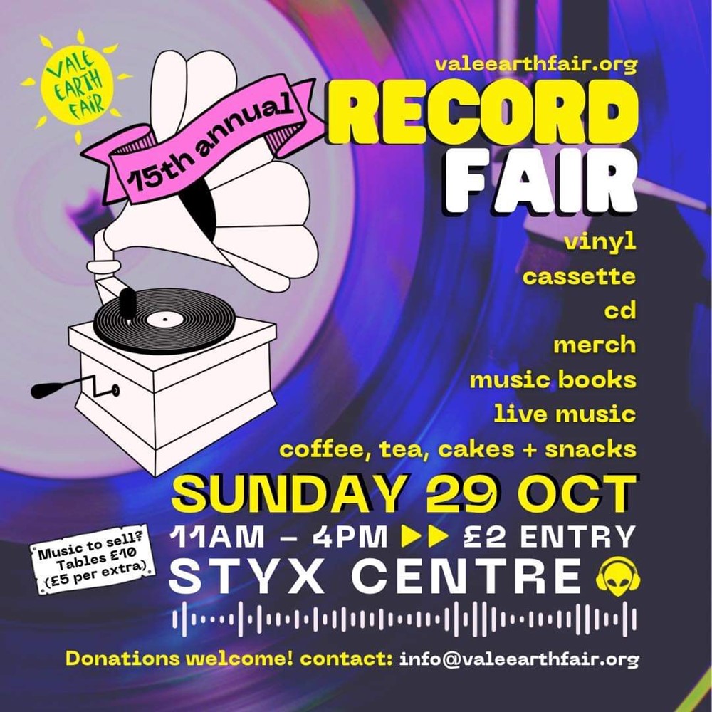 Come and take a look at the many stalls on offer at this year’s Vale Earth Fair record fair, 11am - 4pm, 29th of October at the Styx Centre.